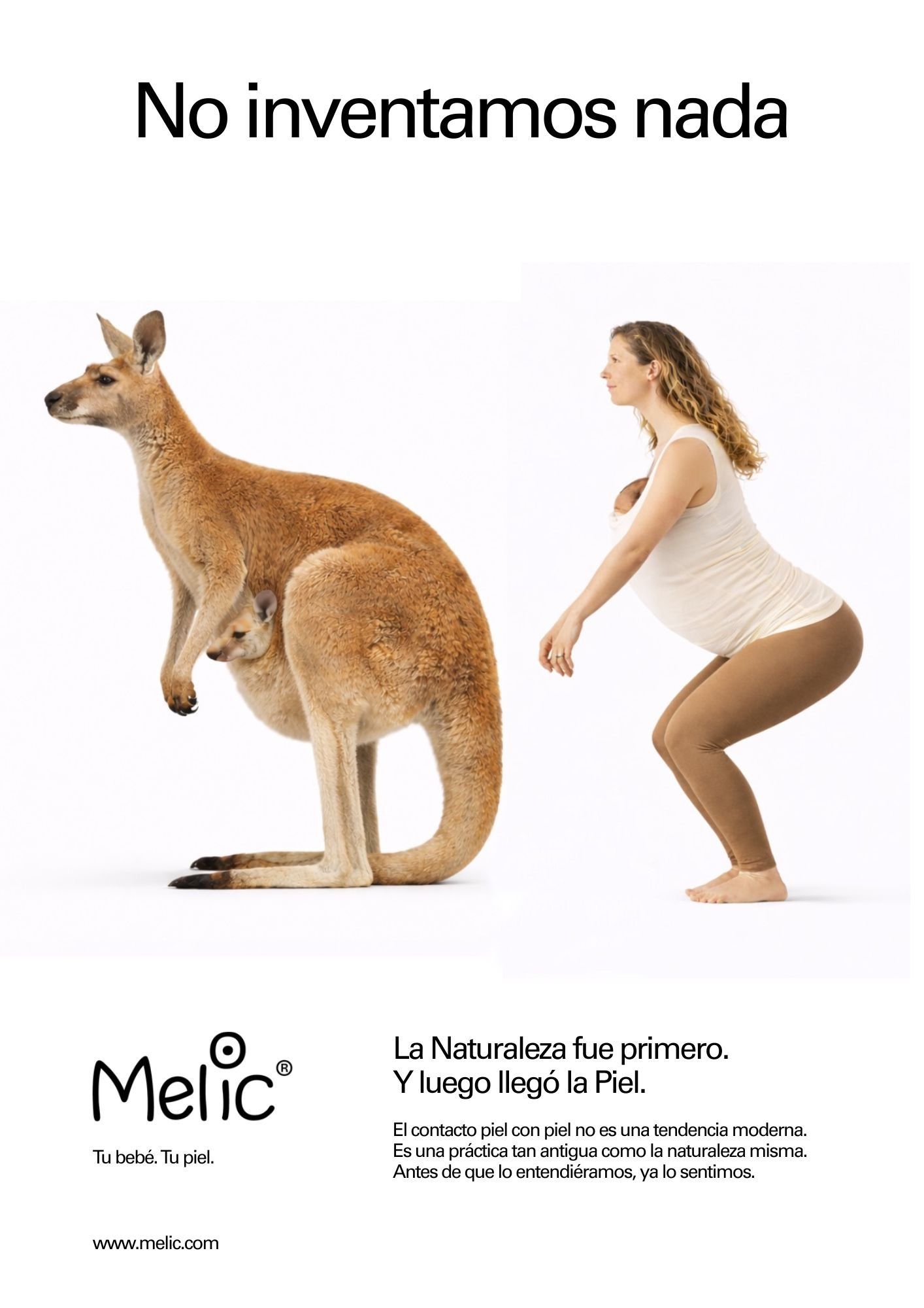 Los visuales principales muestran personas utilizando camisetas Melic en poses que evocan el comportamiento de los marsupiales, estableciendo un paralelismo directo entre naturaleza y crianza humana.