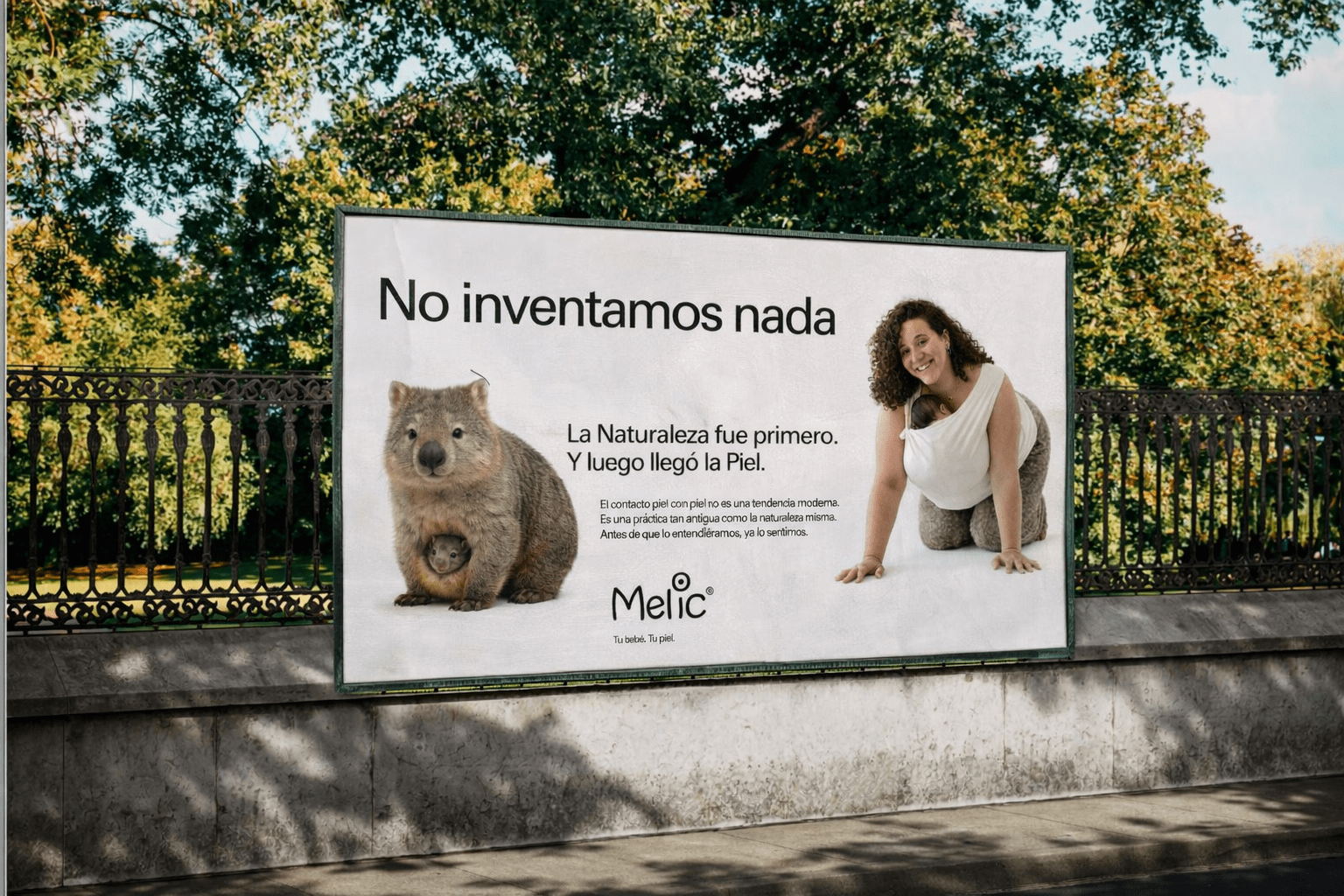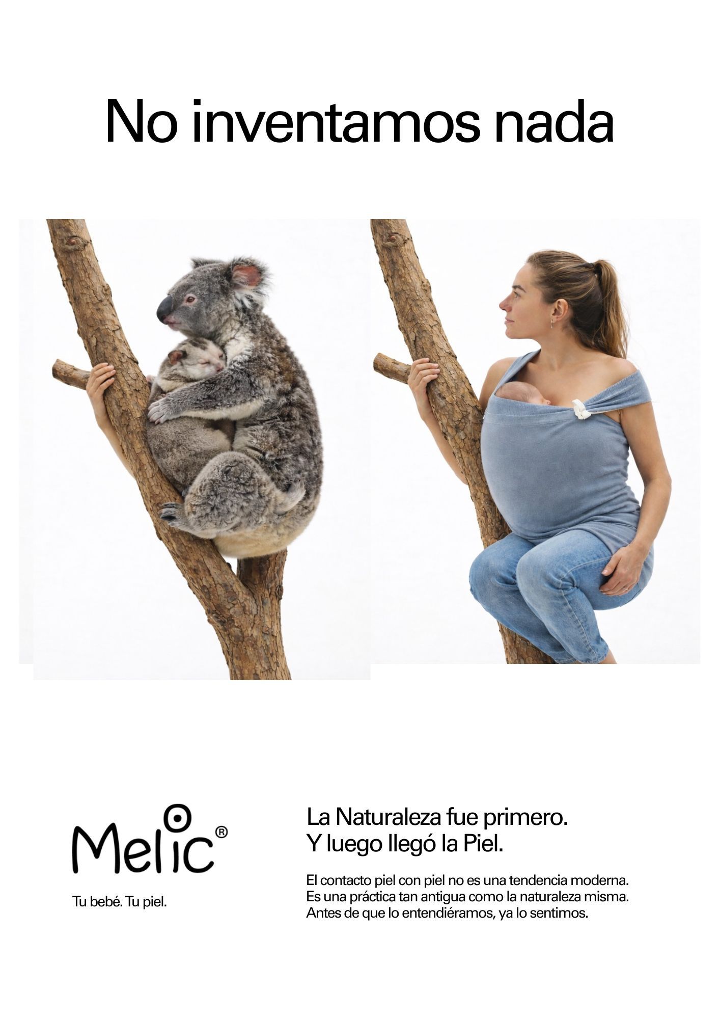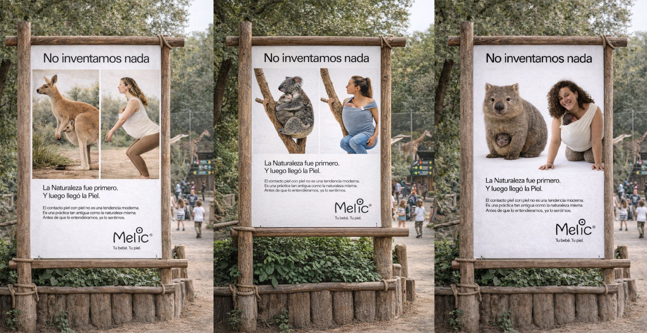 La campaña utiliza la relación entre madres marsupiales y sus crías como metáfora del vínculo humano, reforzando la idea de que el porteo y la cercanía física forman parte de nuestra condición natural.